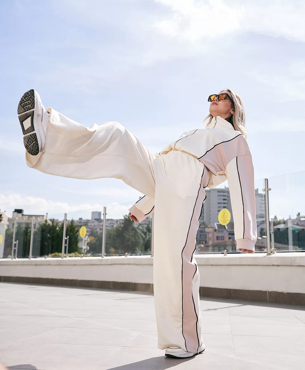 Rahatlığı ve zarifliği bir arada sunan Beyaz Eşofman Takımı, pudra beyaz detaylarıyla sade ama şık bir stil yaratmak isteyenler için ideal bir tercih! Plazo pantolonun bol kesimi ve eşofman üstünün sportif duruşu sayesinde hem günlük yaşamda hem de spor aktivitelerinde rahatça kullanabileceğiniz bu takım, her ortamda tarzınızı yansıtmanıza olanak tanır.